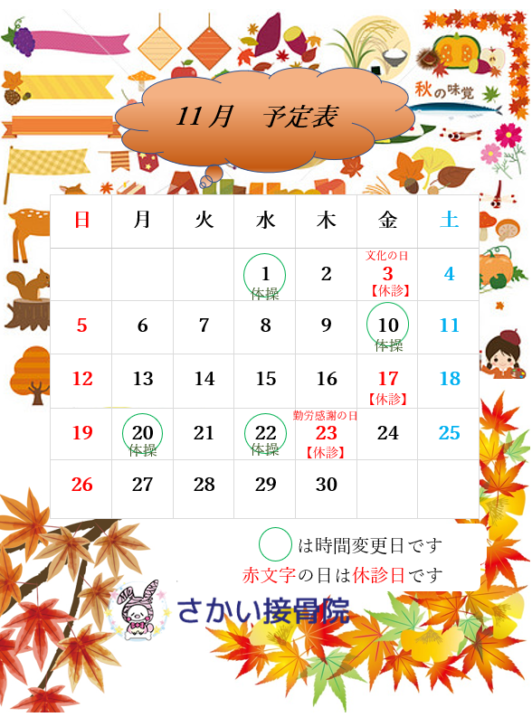 3日(金)文化の日、23日(木)勤労感謝の日、 祝日の為休診いたします。
