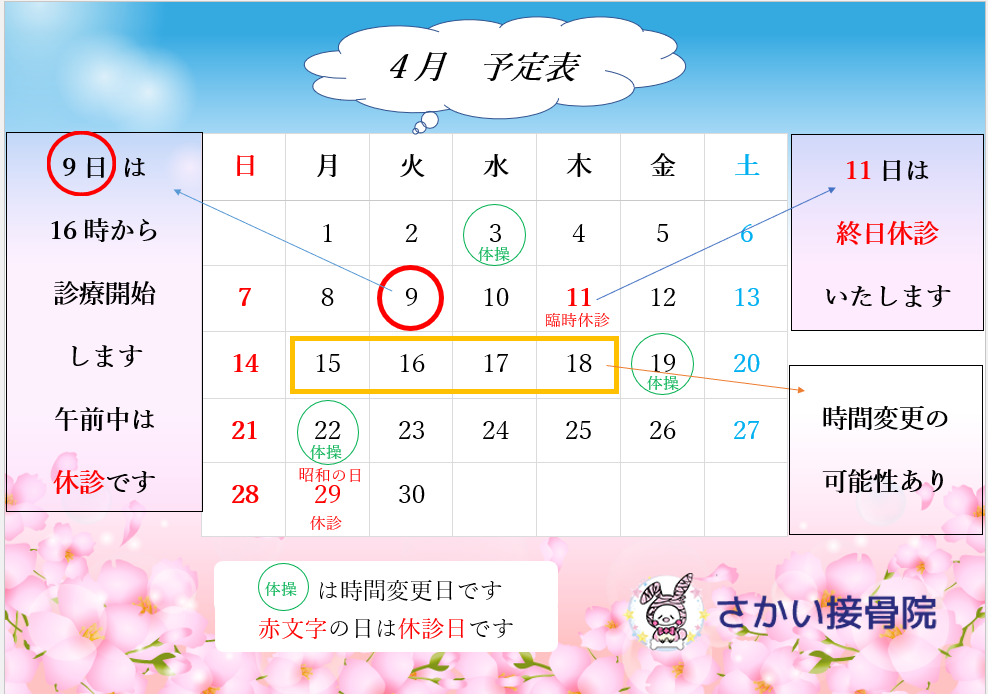 時間変更日:4月9日(火)も都合により午前中を休診、午後4時(16時)から診療を行います。